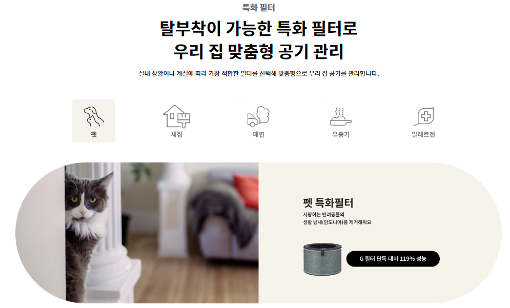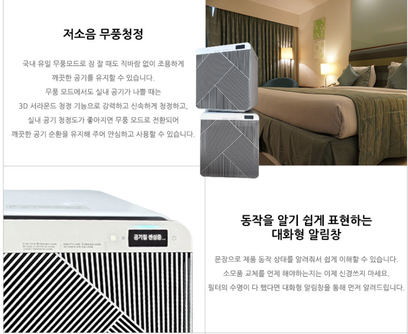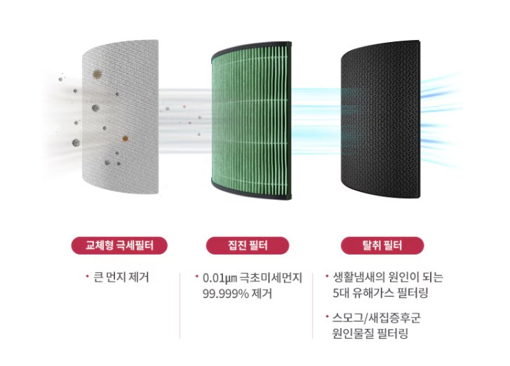 - 필터 시스템: 초미세먼지와 생활 악취를 효과적으로 제거하는 필터 시스템을 갖추고 있습니다.