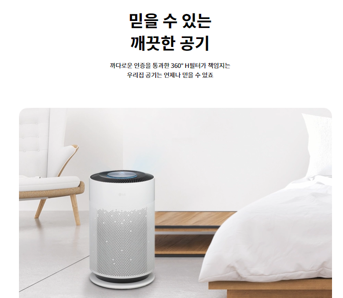 - 스마트 기능: LG ThinQ 앱과 연동되어 스마트폰을 통해 원격으로 공기청정기를 제어하고 실시간 공기 질을 모니터링할 수 있습니다.