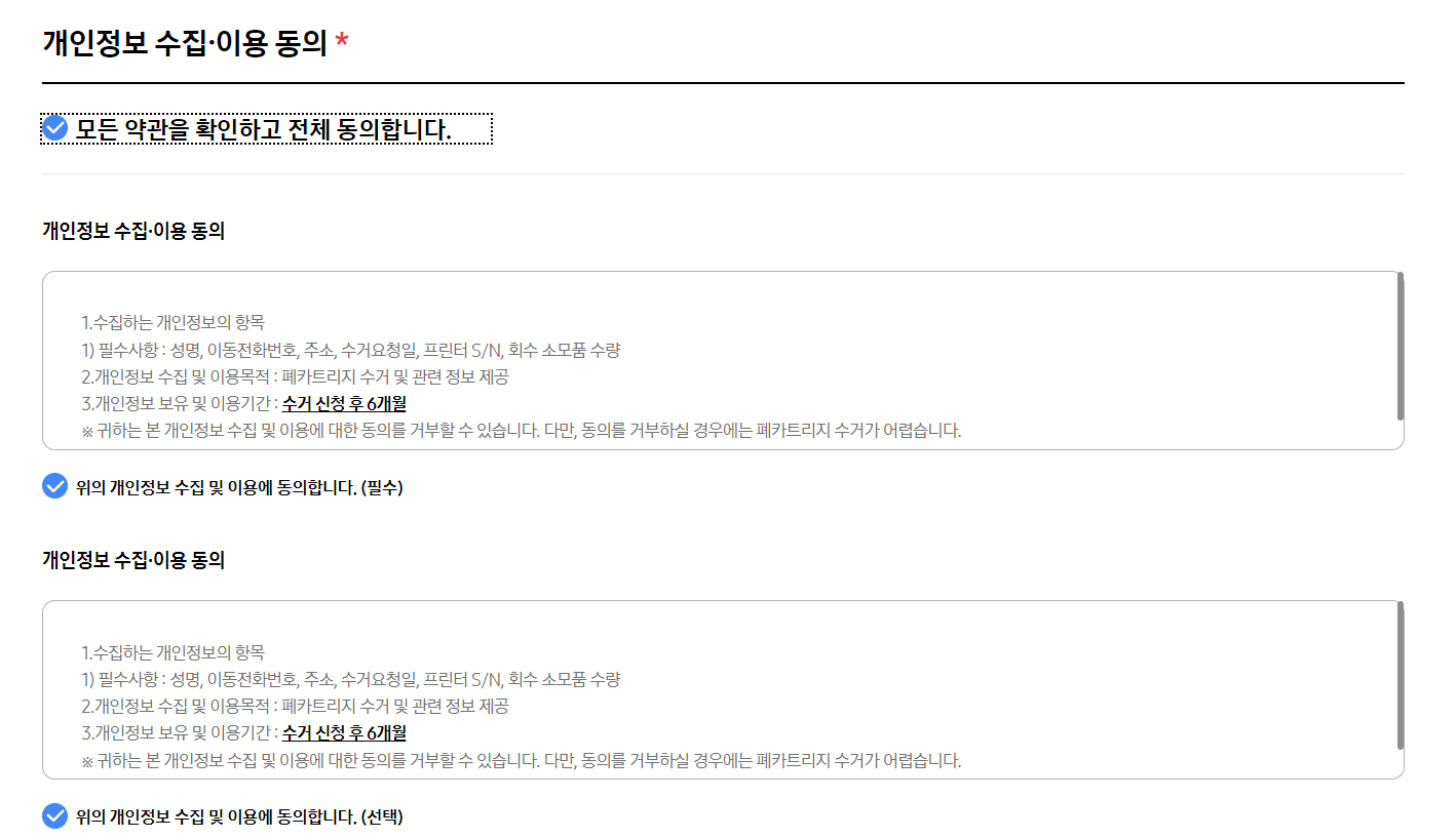 - 페이지 하단의 '부가정보' 섹션에서 '폐카트리지 회수신청'을 선택합니다.